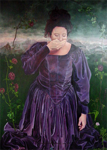 ![]() | Her representations are about the beauty of life that goes beyond that which can be expressed. Her whole show can be gazed at in her self-portrait; a very large painting that dominates Cutcliffe's Gallery at the end of King Street. She has her hand over her mouth, caught in an overwhelming moment at the site of a bird that will die in the traffic, where she can't stop to do anything about it. She is wearing a dress that is once again made of fabulous fabric, made for the occasion, with her hair up and a pre-raphelite landscape lit about her shoulders. She is posed in an arched trellis of deep red roses and the whole, masterfully painted effect is one of beauty beyond words. |