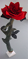 ![]() | The lushest object in her show is a giant velveteen rose that stands in a tiny pot, almost smaller in diameter than its stem. One metaphor is the sense of producing something larger than one expects, larger than is originally provided for. The sown flower refers to craft and flower, the realm of traditional women's art and as such is optimistic as it outgrows but still flourishes in its tiny pot. The work is also a statement about the mechanics of desire, the desire to contain and manage, attributed to the creators of the pot. It states a will to contain the feminine subject where the creator sees herself as the subject that has been contained. |