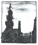 Santoro's heart is after the atmosphere in landscape where the light in a scene evokes a feeling. The works has, "lots to do with light and the way you experience light", the light that illuminates a place in a way that elevates the experience of seeing beyond an ineffectual object. This is usually a scene lit by the sun as it leaves at the end of a day. A small ink and wash drawing of Dresden on a grey and wet day not only carries a scene that transfixes. It also conveys the dark and sooty trauma of the place through wild contrast where light glances off a rooftop like an impenetrable mirrored surface.